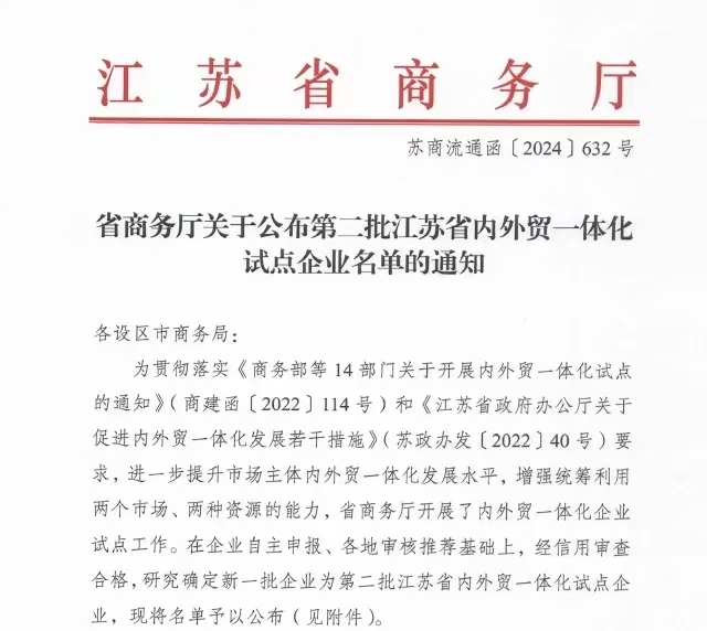 此次試點企業(yè)的評選,是江蘇省積極響應(yīng)國家商務(wù)部等14部門聯(lián)合發(fā)布的《關(guān)于開展內(nèi)外貿(mào)一體化試點的通知》(商建函〔2022〕114號),并結(jié)合《江蘇省政府辦公廳關(guān)于促進內(nèi)外貿(mào)一體化發(fā)展若干措施》(蘇政辦發(fā)〔2022〕40號)文件精神,旨在通過構(gòu)建高效聯(lián)通的內(nèi)外貿(mào)體制機制,打通內(nèi)外貿(mào)堵點,促進國內(nèi)國際雙循環(huán)相互促進的新發(fā)展格局。